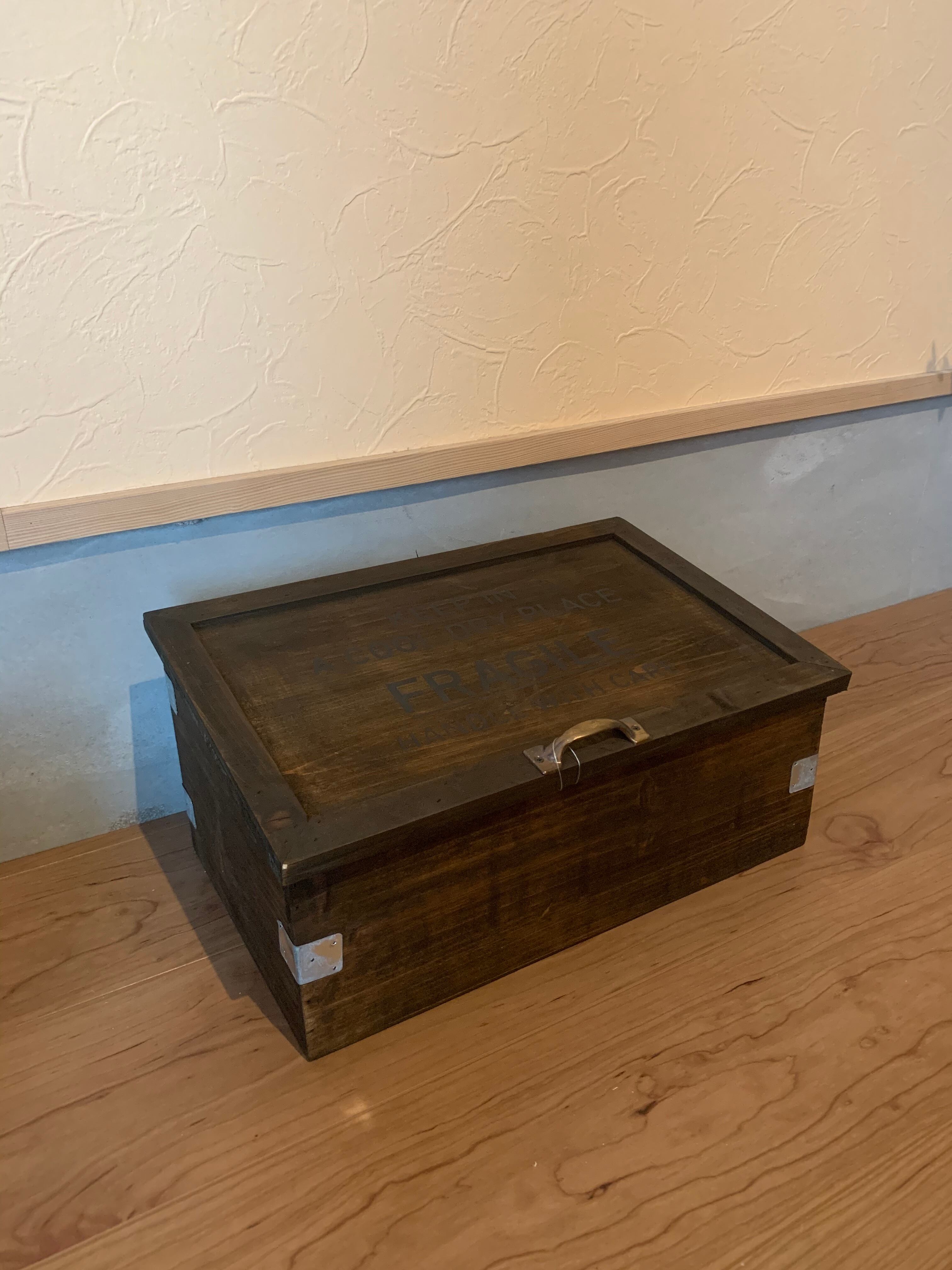 ★FRAGILE HANDLE WITH CARE=こわれものにつき取扱注意という意味のプリントとコーナーのメタルパーツがアクセントとなったヴィンテージ風木製品シリーズ。